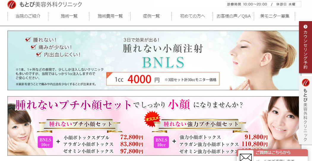 2本目からは9,000円近くかかるクリニックも多い中、もとび美容外科クリニックはBNLSのトータル料金がお得になるので一度カウンセリングを受けてみるとよいかもしれません。